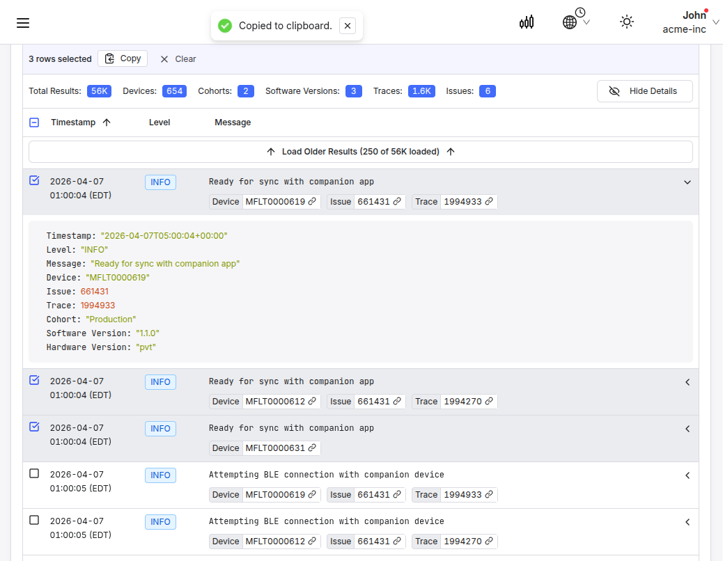 Copying from the Log Explorer now produces clean, tab-separated output (timestamp, level, message) ready to paste into a spreadsheet or bug report. Multi-row selection with keyboard shortcuts is also supported, making it faster to grab exactly the lines you need.