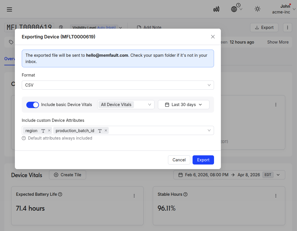 You can also export data directly from a single device's detail page, making it easier to pull a single device's history for offline analysis or sharing with hardware teams.