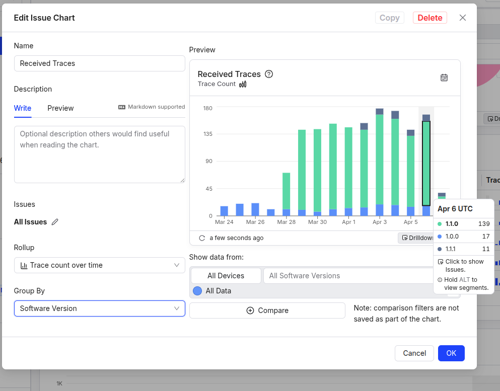 Issue Chart: Trace Count Over Time cards now support a "Software Version" group-by option, letting you see trace volume broken down by the versions of software running across your fleet. This makes it easy to confirm whether a bug affects a specific release or spans multiple versions.
