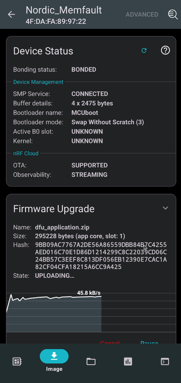 Using the nRF Device Manager app, you can tap "Update" to trigger an upload to nRF Cloud, forwarding new diagnostic data to the system.