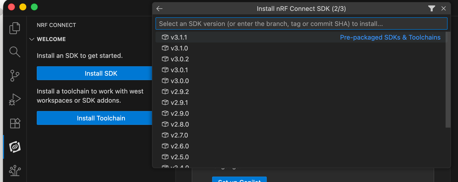Choose "Install SDK" from the sidebar, select "nRF Connect SDK", and choose the SDK version you wish to install, i.e. the latest released.