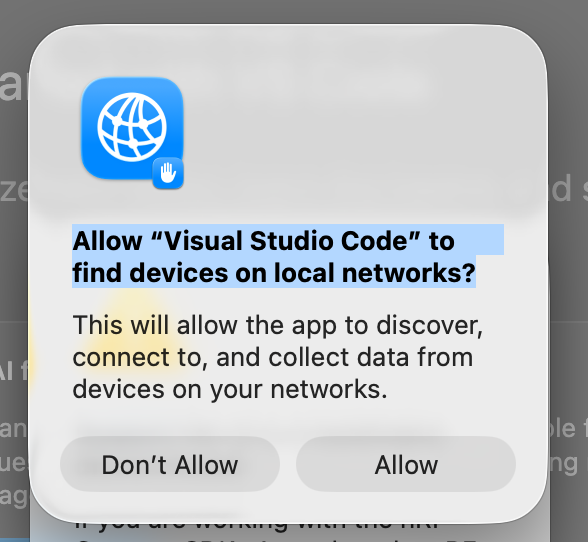 - "Allow "Visual Studio Code" to find Devices on local networks?" This lets VS Code see BLE devices. Choose "Allow"
