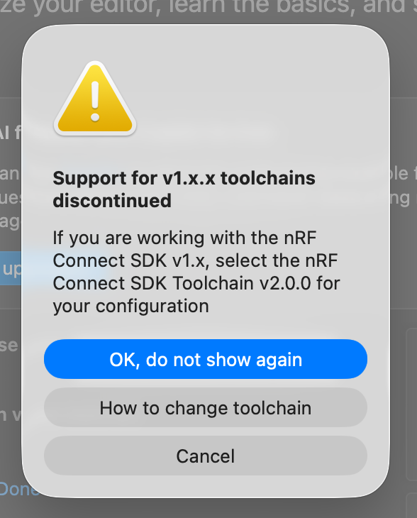 - Support for v1.x toolchains discontinues: choose "OK, do not show again"