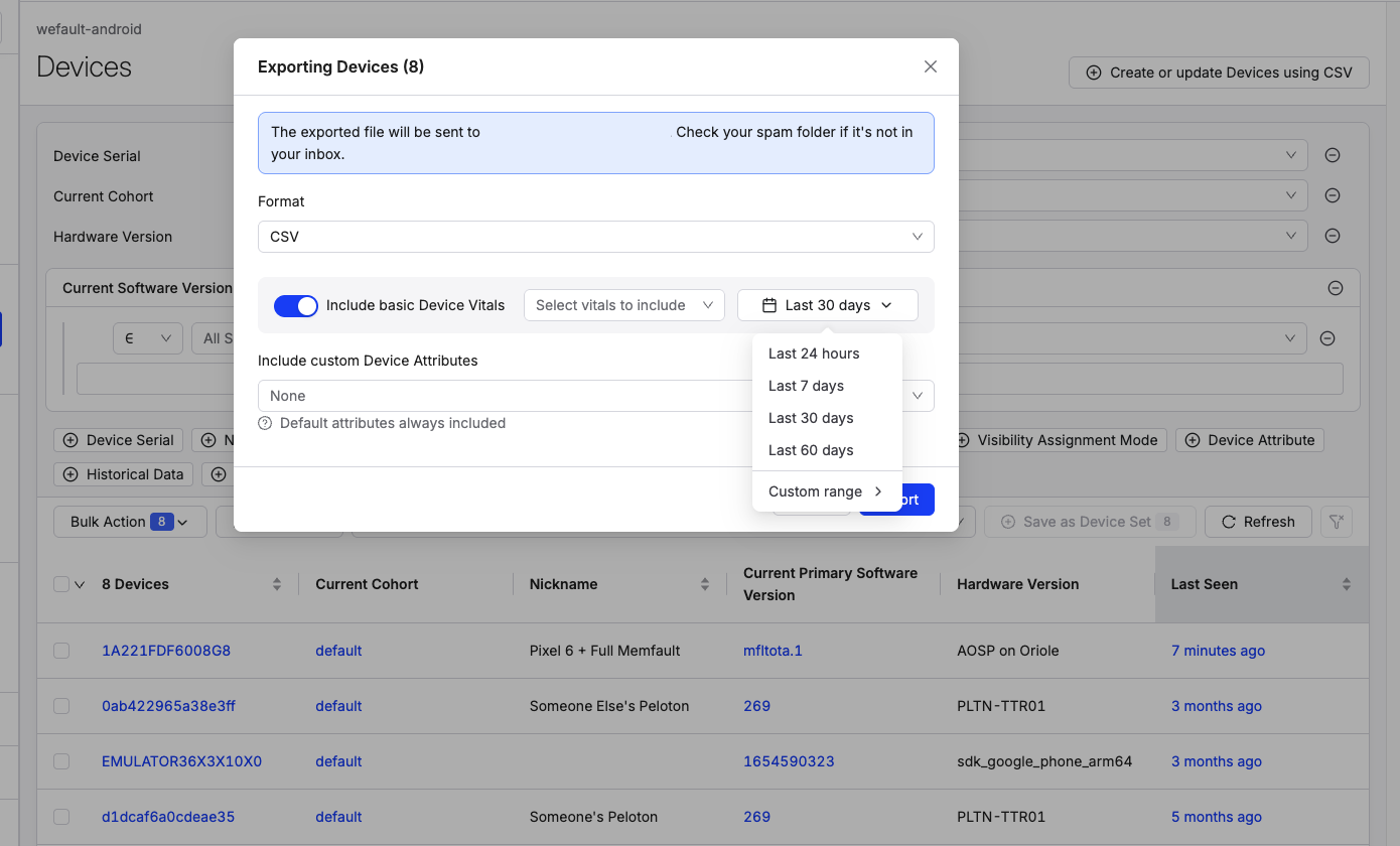 Using the "Export" menu, you can bulk export lists of Devices and associated information as a CSV file. Use search filters to define the desired list of Devices and then export that list as a CSV. Once the CSV is generated, it will be emailed to you. This makes it easy to share information on specific groups of Devices to teams in the organization outside Memfault for further processing in external tools or scripts for logistics, reporting, etc.